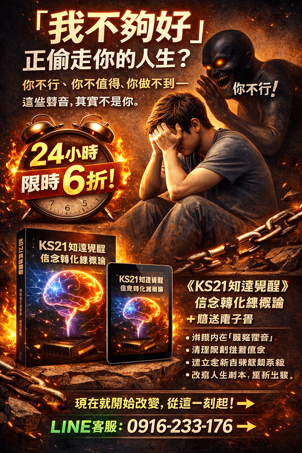 《KS21知達覺醒》2.1信念轉化階課程總概論,就是要帶你認出那個困住你多年的聲音。你會學到:什麼是信念?為什麼你相信的,正在創造你的人生?以及如何從「看見」進階到「改寫」,把舊的、限制性的信念像垃圾一樣清空,再把支持你成長的新信念搬進心裡。